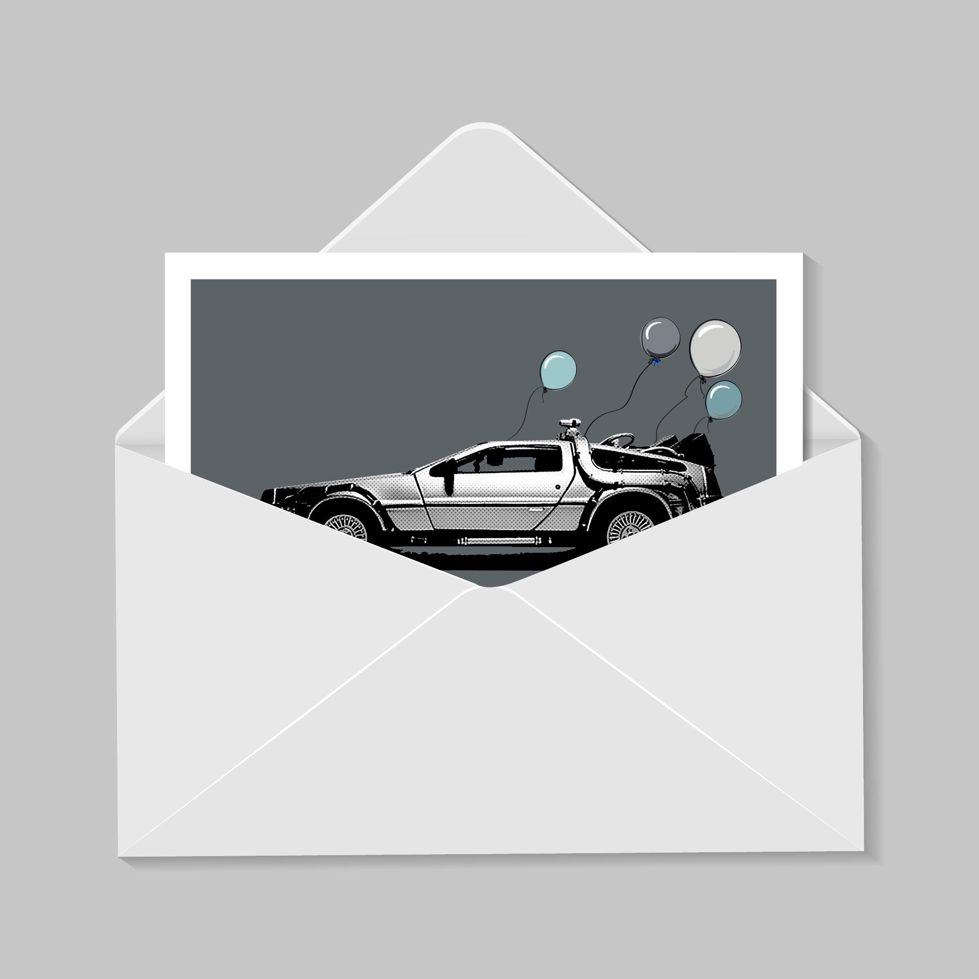 Birthday-themed illustration of the DeLorean car in Back to the Future.