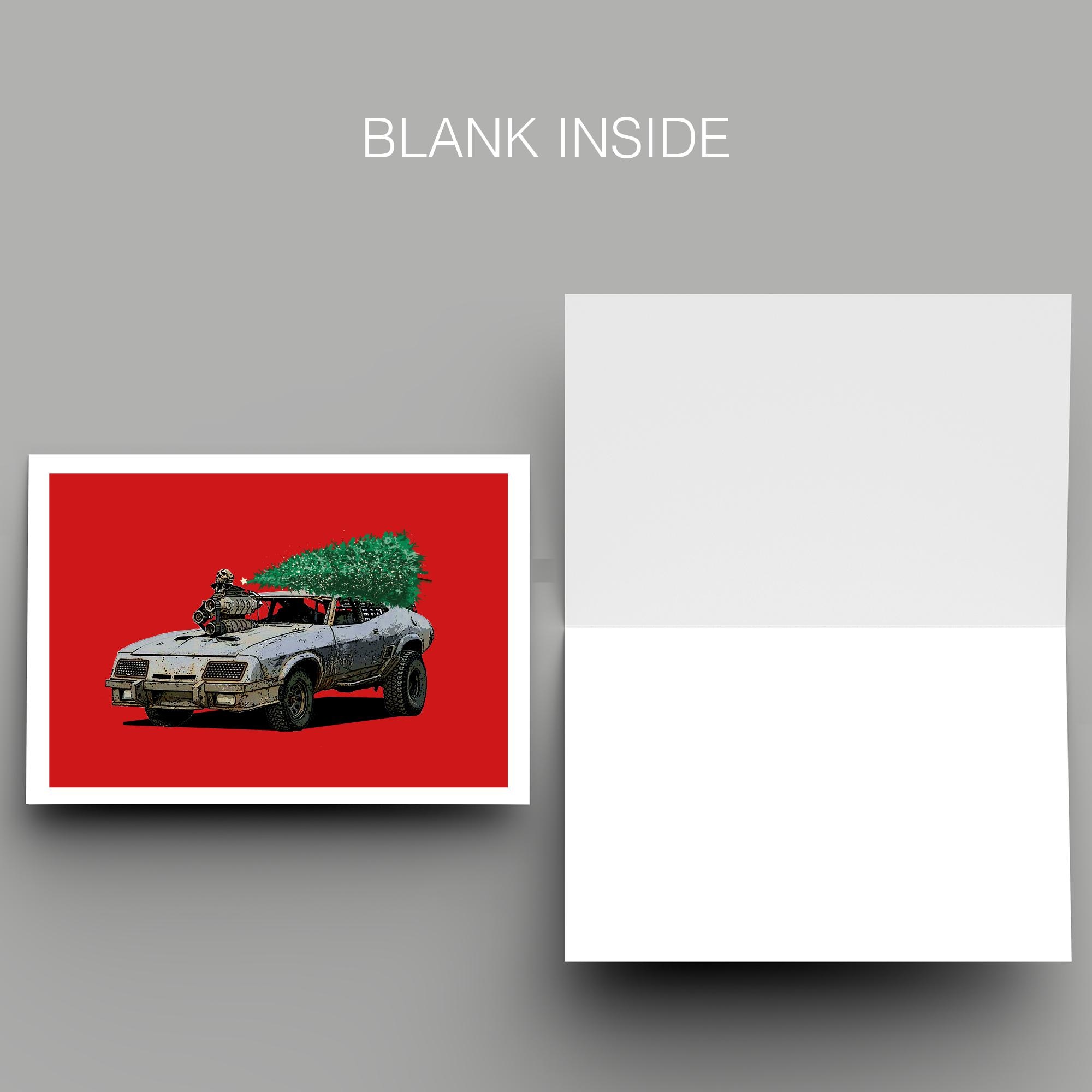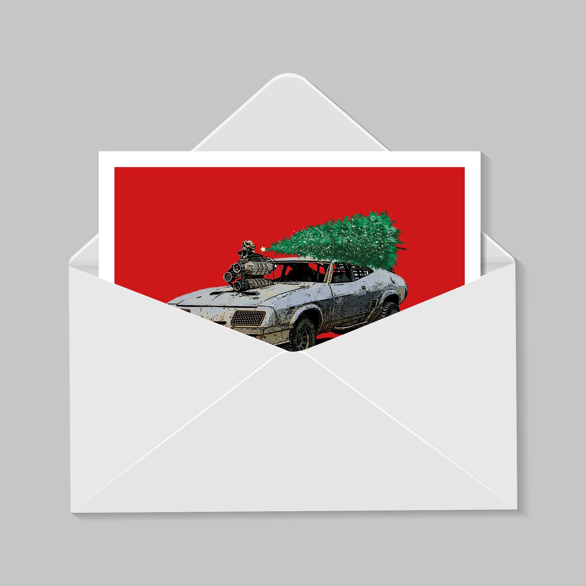 Christmas-themed illustration of the iconic Ford Falcon in Mad Max: Fury Road.