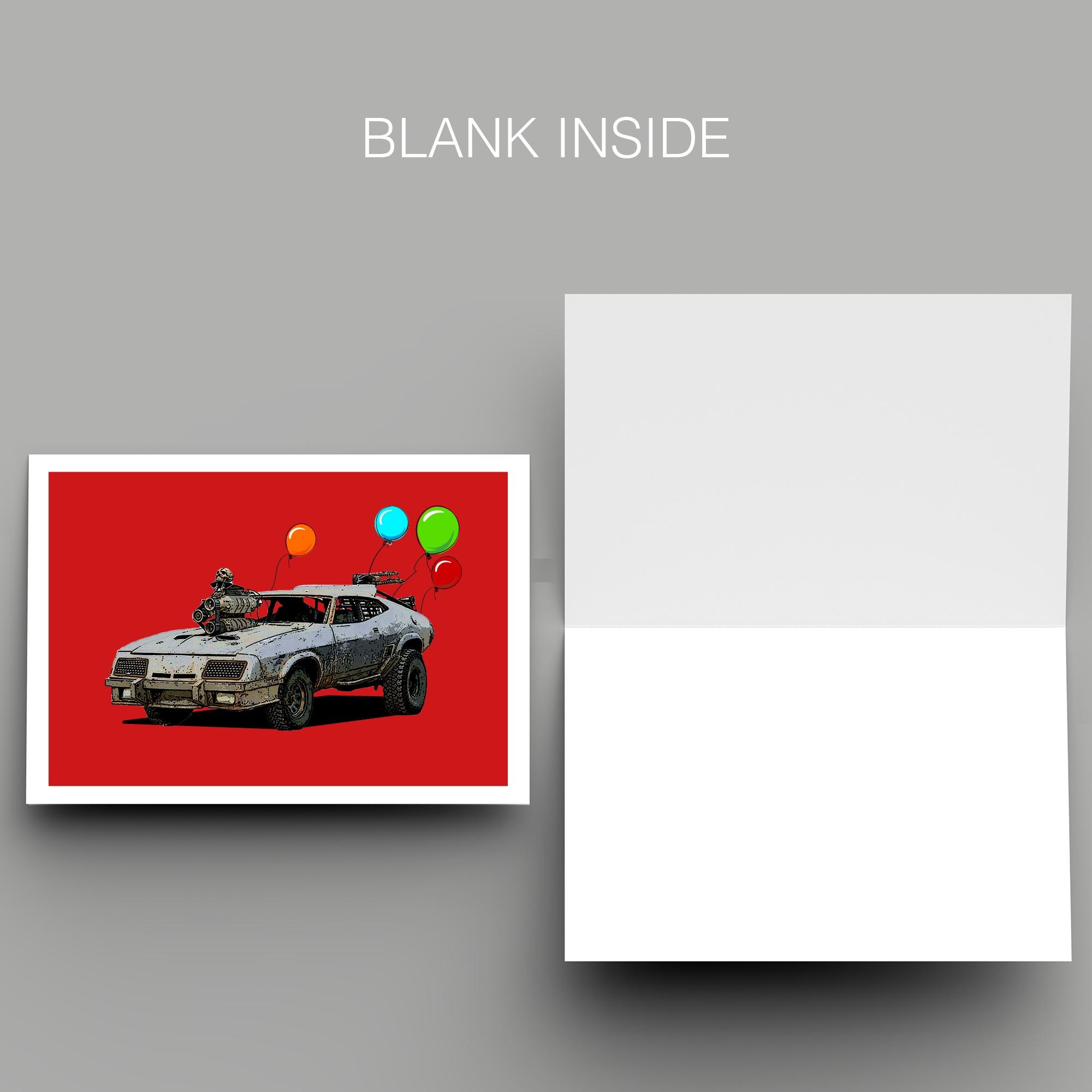 Birthday-themed illustration of the iconic Ford Falcon in Mad Max: Fury Road.